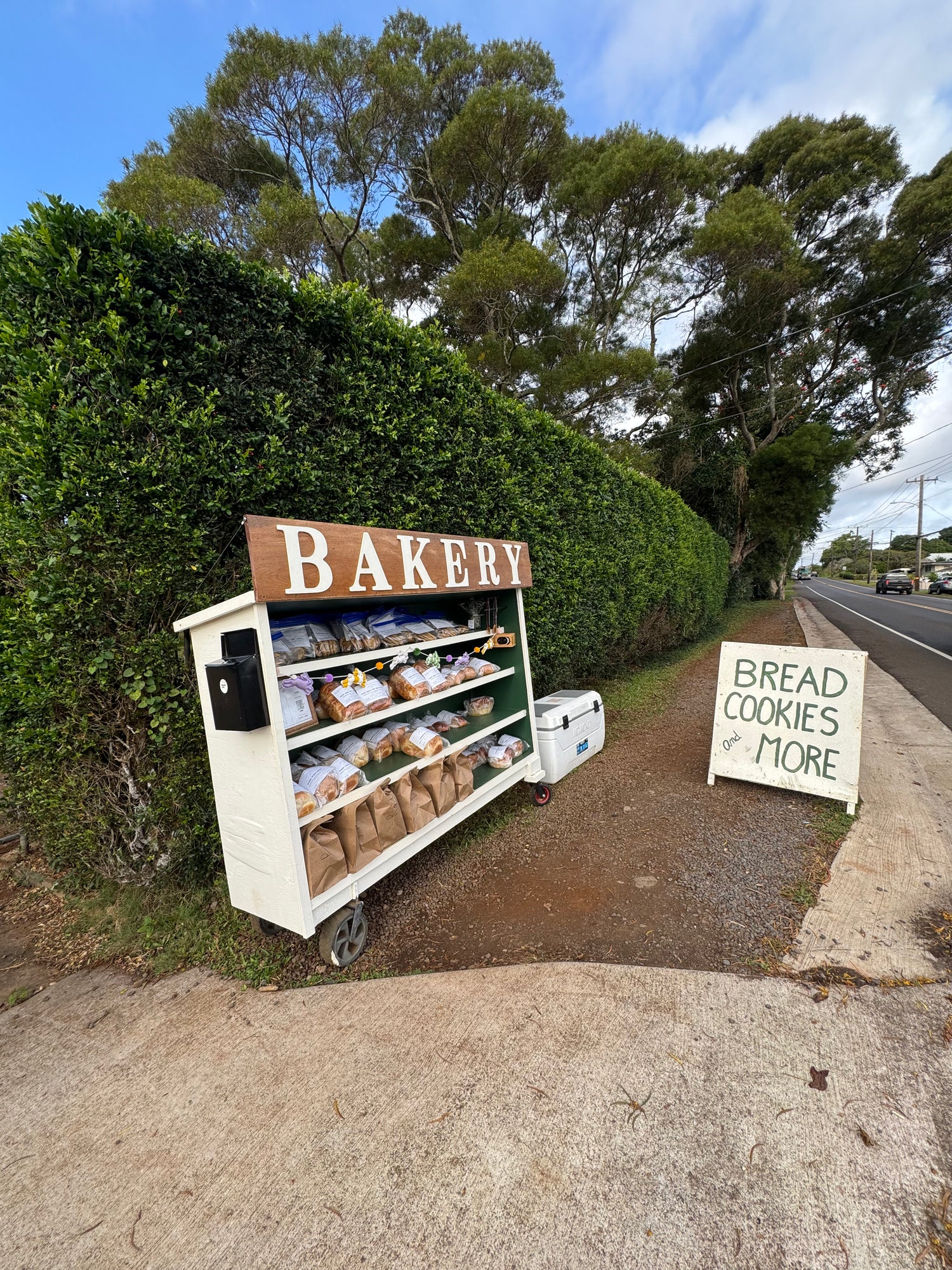 Our main bakery stand at 4122 Koloa Rd is open everyday except Saturdays from 7:00 AM to 7:00 PM, offering fresh bread, cookies, and a rotating selection of homemade goods. Everything is made by our family each day, and the stand is stocked so customers can stop by anytime for something simple, fresh, and delicious.